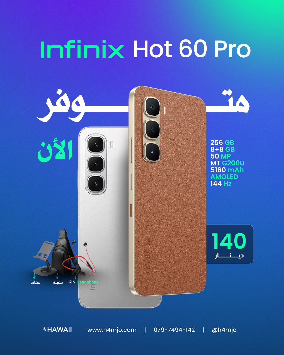 #Infinix #Hot60Pro #هواتف_ذكية #عروض_هاواي #تكنولوجيا #شاشة_AMOLED #أداء_قوي #عروض_خاصة #الأردن #موبايلات_الأردن #تقنيات_حديثة #InfinixJordan #هاتف_جديد #توفير